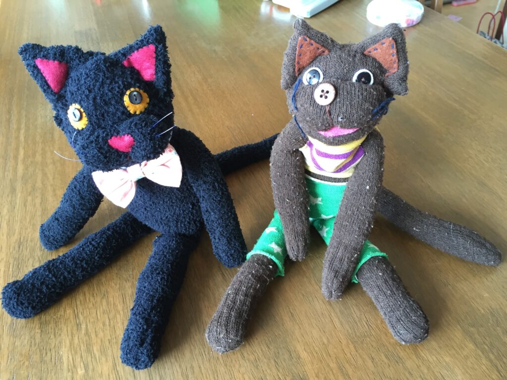 △チーの入院に付き合ってくれた年季の入ったソックキャット(靴下で作る猫さんです)は、ニイニが貸してくれました。黒猫ちゃんは友人のお子さんにプレゼント用に作ったものです。